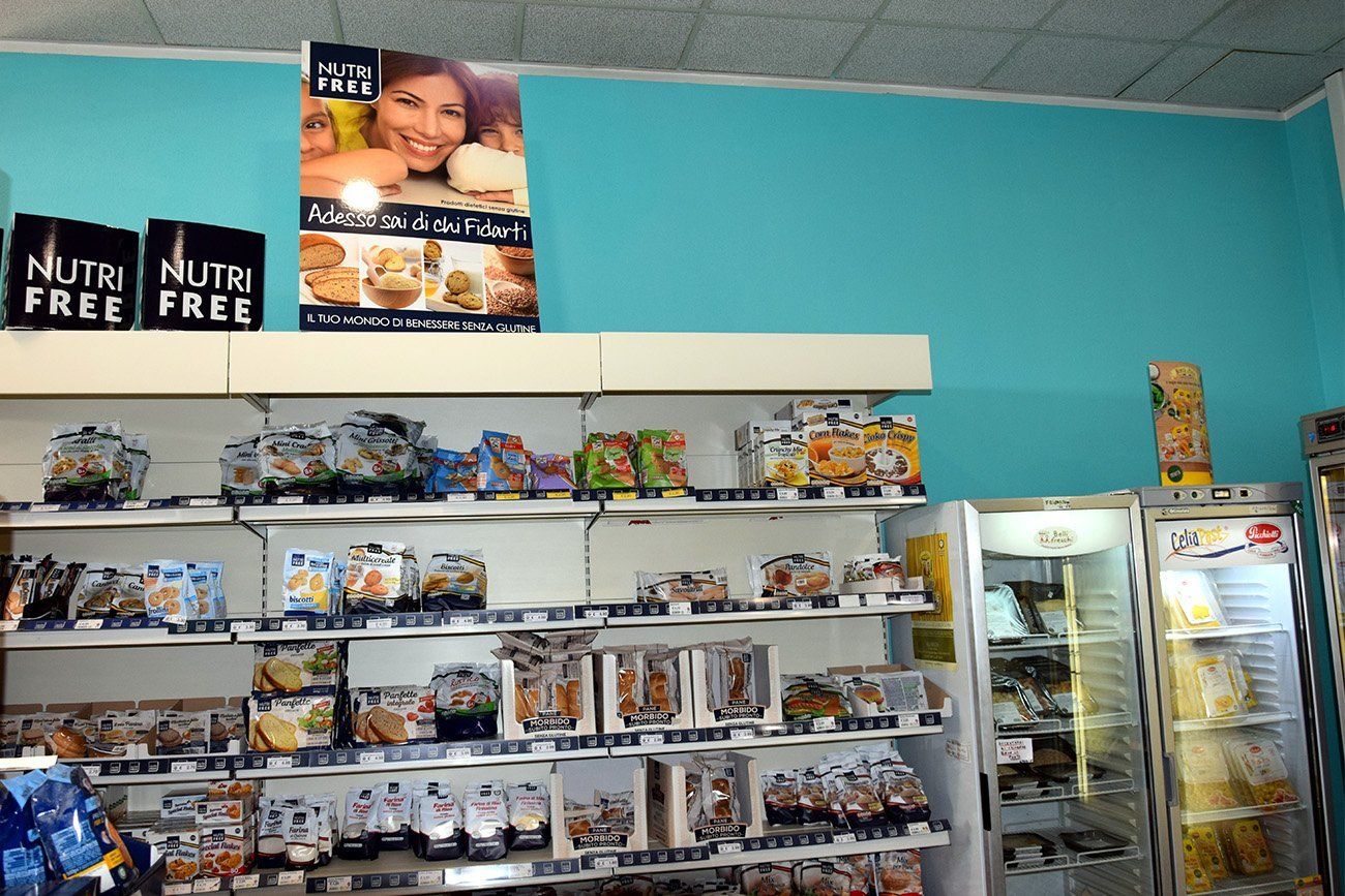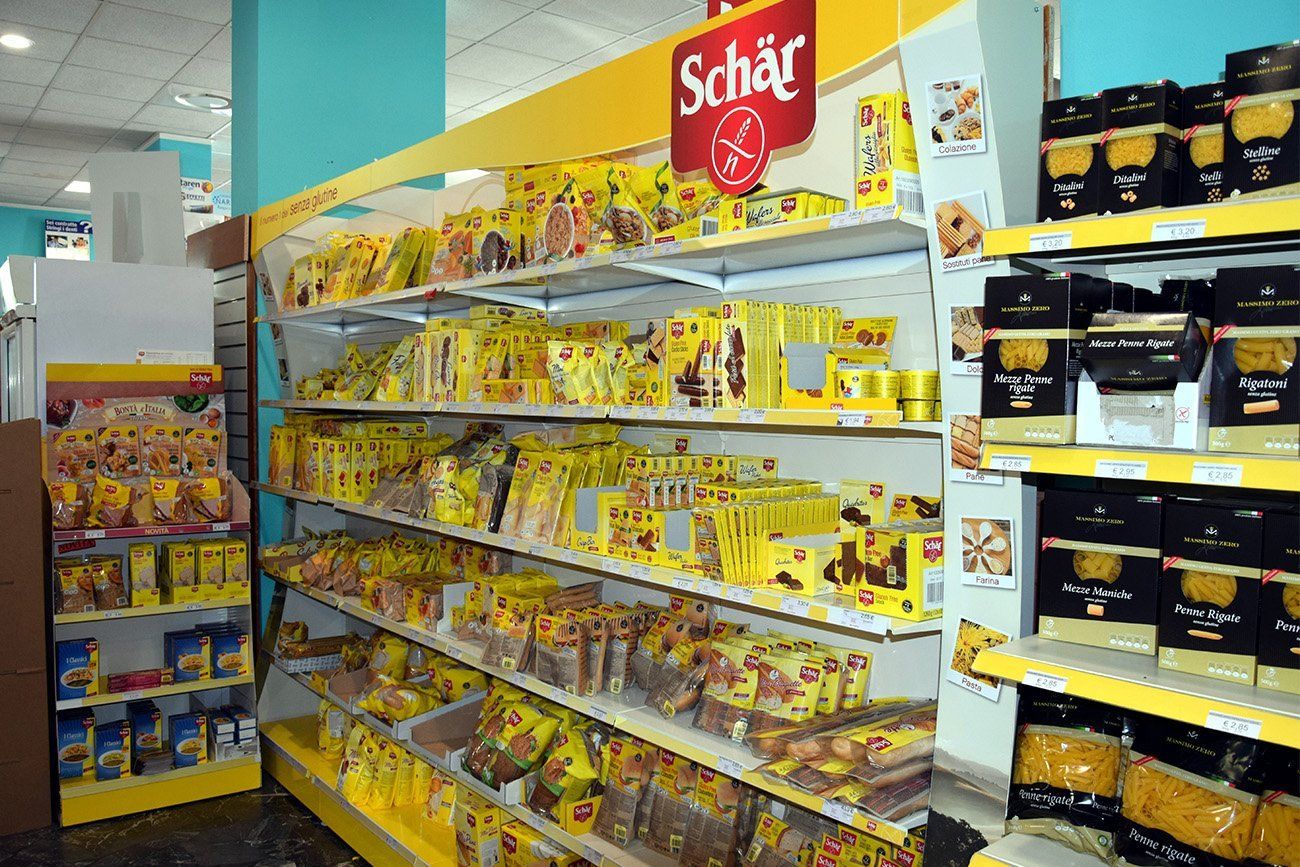 Nella nostra farmacia abbiamo circa 100 mq dedicati all'esposizione di alimenti senza glutine: al loro interno potrete trovare una vasta gamma di articoli, comprensivi di prodotti secchi e prodotti da frigo.